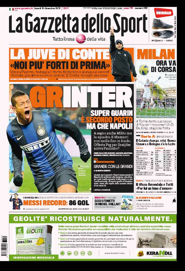 Gazzetta dello Sport: GrInter 10/12/2012 di Admin3 GAZZETTA INTER – Super Guarin trascina l’Inter contro il Napoli e vince due a uno. La redazione di Calciomercatonews.com