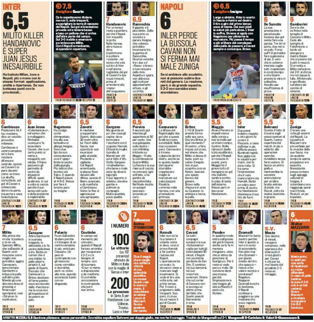 INTER NAPOLI VOTI PAGELLE GAZZETTA – Di seguito potete visionare i voti e le pagelle Gazzetta dello Sport relativi alla sfida fra il Napoli e l’Inter, gara valevole per il sedicesimo turno di Serie A e conclusasi con il risultato di 2 a 1 in favore dei nerazzurri. Il migliore dell’incontro in assoluto è stato Fredy Guarin (voto 7,5), autore di una prestazione da urlo in posizione da trequartista. In casa Napoli molto bene il gioiellino Lorenzo Insigne, premiato dalla Rosea con un 6.5.