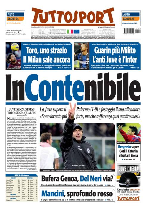 Tuttosport: InContenibile 10/12/2012 di Admin3 TUTTOSPORT CONTE – Conte ritorna in panchina e la Juventus vince uno a zero a Palermo. la redazione di Calciomercatonews.com