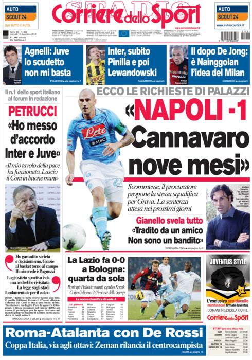 Corriere dello Sport: “Napoli -1, Cannavaro 9 mesi” 11/12/2012 di Admin3 CORRIERE NAPOLI CANNAVARO – Sul Corriere dello Sport si parla delle richieste di Palazzi per lo scandalo del Calcioscommesse. Napoli meno uno e 9 mesi per Cannavaro. La redazione di Calciomercatonews.com