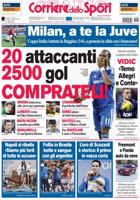 Corriere dello Sport: 20 attaccanti, 2500 gol, Comprateli 14/12/2012 di Admin3 CORRIERE ATTACCANTI – Sul Corriere dello Sport si parla degli attaccanti liberi che potrebbero essere acquistati a gennaio. La redazione di Calciomercatonews.com