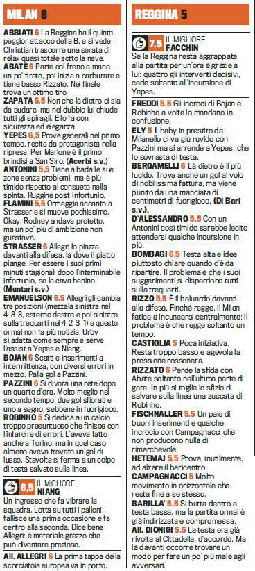 MILAN REGGINA VOTI PAGELLE GAZZETTA – Di seguito potete visionare i voti e le pagelle Gazzetta dello Sport relativi alla sfida fra il Milan e la Reggina, gara valevole per gli ottavi di finale di Coppa Italia e conclusasi con il risultato di 3 a 0 per il Milan, gol di Yepes, Niang e Pazzini. Il migliore dell’incontro in assoluto è stato proprio il giovane talento francese, che entrato nella ripresa ha mostrato tutta la propria grinta nonchè le interessanti qualità riuscendo anche a segnare il primo gol ufficiale con la maglia del Milan.