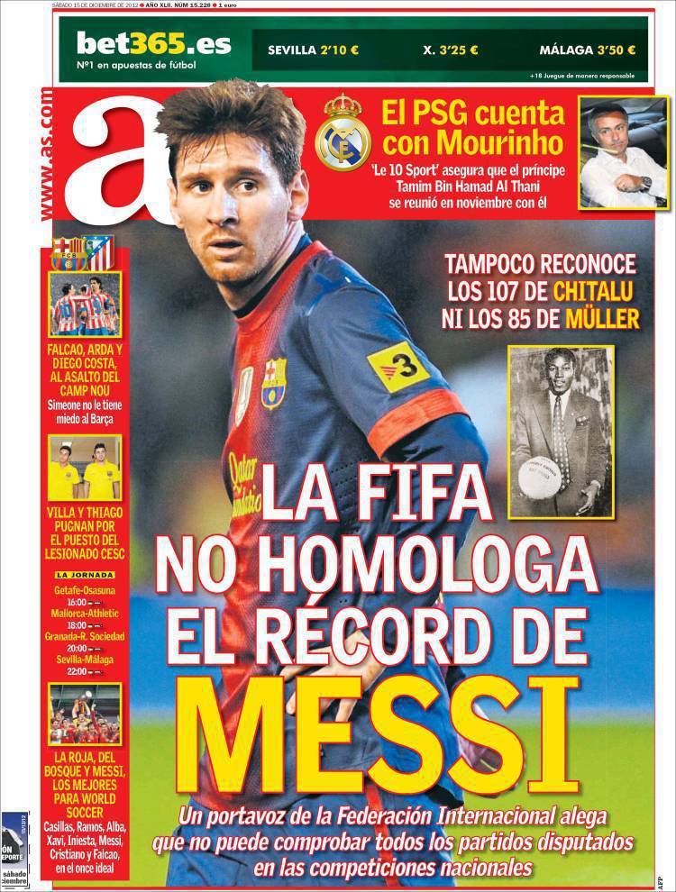 As: La Fifa non omologa il record di Messi 15/12/2012 di Admin3 AS FIFA MESSI – Sul quotidiano As si parla del record di Messi non omologato dalla Fifa. La redazione di Calciomercatonews.com