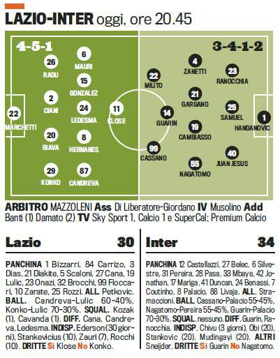 LAZIO INTER PROBABILI FORMAZIONI – Poco più in basso potete visionare le probabili formazioni di Lazio-Inter, firmate Gazzetta dello Sport, match valevole per il diciassettesimo turno di Serie A, gara che si giocherà questa sera alle ore 20.45 in quel dell’Olimpico di Roma. Ancora out Wesley Sneijder, non convocato per il big match. Stramaccioni potrebbe puntare sul 3-4-1-2 con Diego Milito-Antonio Cassano davanti e con Fredy Guarin di nuovo nella posizione di trequartista, ruolo in cui ha fatto benissimo nell’ultima uscita.