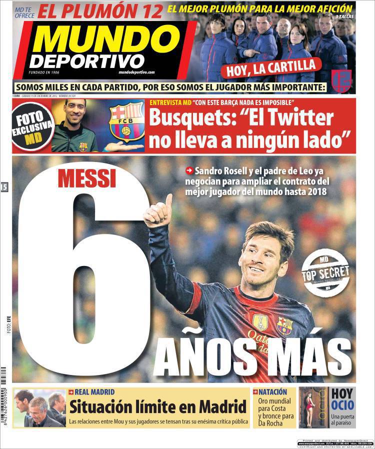 Mundo Deportivo: Più sei anni 15/12/2012 di Admin3 MUNDO DEPORTIVO MESSI – Sul quotidiano Mundo Deportivo si parla di Messi che è pronto a rinnovare l’accordo con il Barcellona fino al 2018. La redazione di Calciomercatonews.com