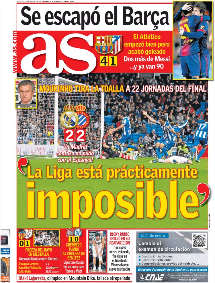 As: “La Liga è praticamente impossibile” 17/12/2012 di Admin3 AS LIGA – Mourinho alza bandiera bianca per la Liga nonostante manchino 22 giornate. La redazione di Calciomercatonews.com