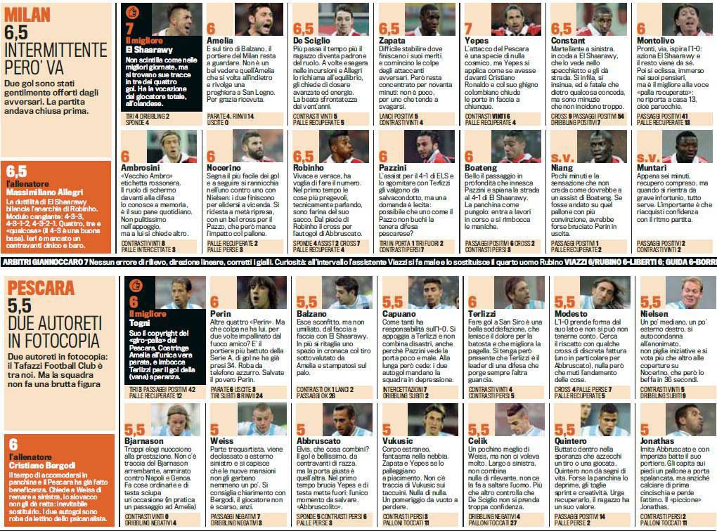 MILAN PESCARA VOTI PAGELLE GAZZETTA SPORT FOTO – Poco più in basso potrete visionare i voti e le pagelle Gazzetta dello Sport della sfida Milan-Pescara, match valevole per il diciassettesimo turno di Serie A, giocatosi ieri pomeriggio allo stadio San Siro e conclusosi con il risultato di 4 a 1 in favore del Milan. Il migliore in assoluto dell’incontro è stato il solito Stephan El Shaarawy, ieri ancora in gol, per la quattordicesima volta da inizio stagione. Ottima prova anche di Mario Yepes, sempre attento in difesa.