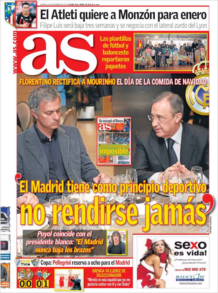 As: “Il Real Madrid non si arrende mai” 18/12/2012 di Admin3 AS REAL MADRID – Sul quotidiano As si parla di Perez, presidente del Real Madrid, che ha detto a Mourinho il principio sportivo del Real. La redazione di Calciomercatonews.com