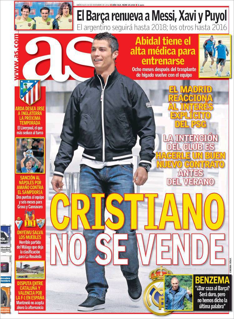 As: Cristiano non si vende 19/12/2012 di Admin3 AS RONALDO – Sul quotidiano As si parla di Cristiano Ronaldo che non verrà ceduto dal Real Madrid. la redazione di Calciomercatonews.com