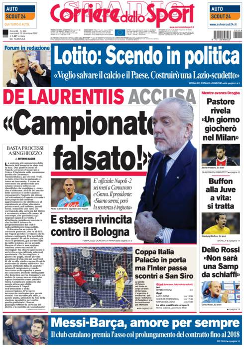 CORRIERE NAPOLI – De Laurentiis furibondo per la penalizzazione del Napoli per il Calcioscommesse.