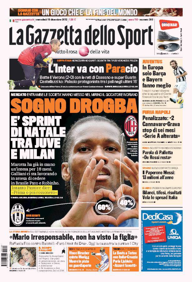 GAZZETTA DROGBA – Sulla Gazzetta dello Sport si parla di Drogba che piace a Juventus e Milan.
