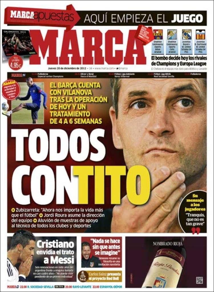 Marca: Tutti con Tito 20/12/2012 di Admin3 MARCA VILANOVA – Sul quotidiano Marca si parla di Vilanova che è nuovamente malato di tumore. La redazione di Calciomercatonews.com