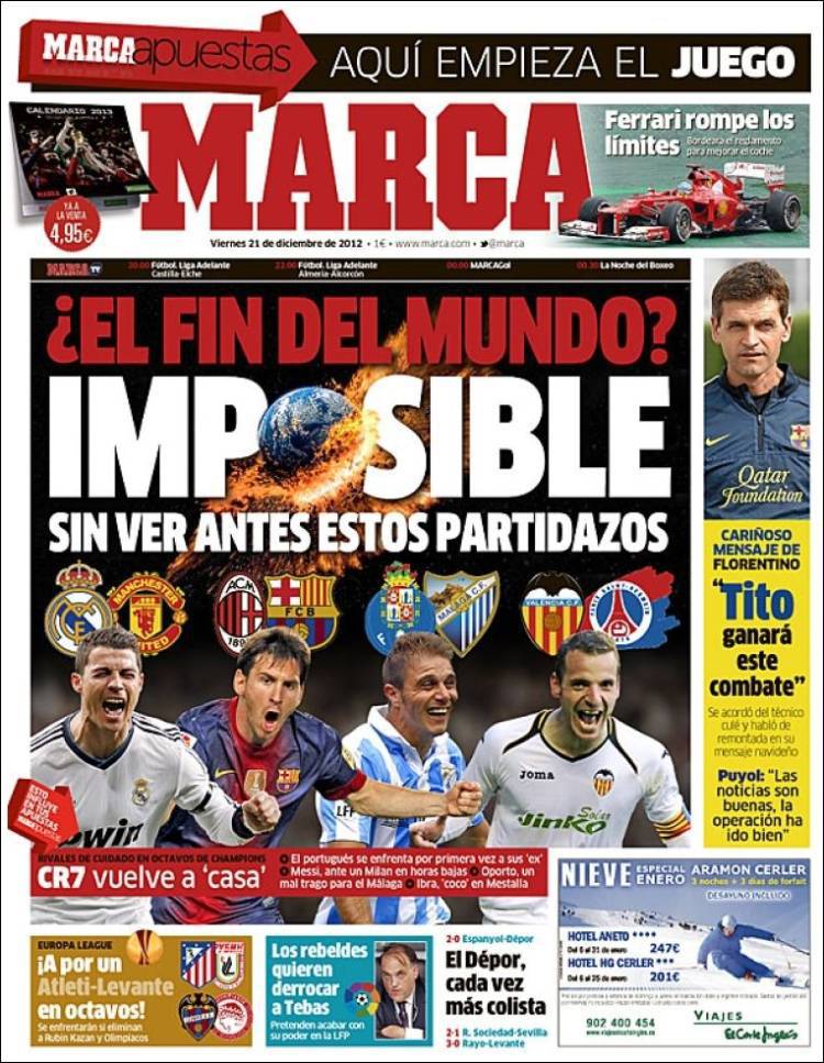 Marca: La fine del mondo? Impossibile se non prima.. 21/12/2012 di Admin3 MARCA CHAMPIONS – Il quotidiano Marca dice che la fine del mondo potrà arrivare solo dopo aver visto le grandi sfide di Champions. Real Madrid-Manchester United, Milan-Barcellona, Valencia-Psg e Porto-Malaga. La redazione di Calciomercatonews.com