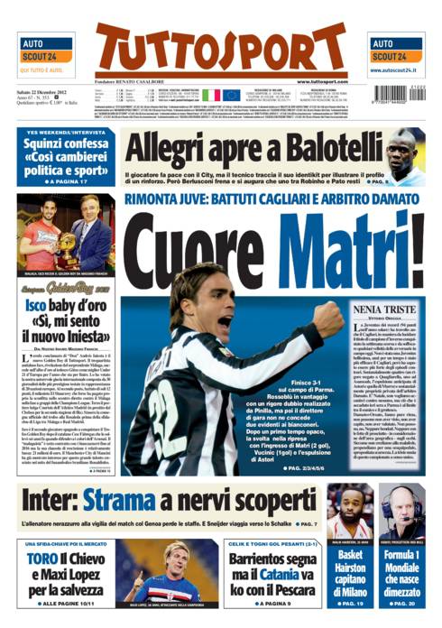 TUTTOSPORT MATRI – Su Tuttosport viene elogiato Matri autore di una doppietta decisiva nel tre a uno della Juventus sul Cagliari.