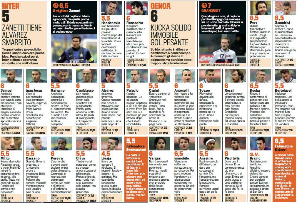 INTER GENOA VOTI PAGELLE GAZZETTA – Di seguito potete visionare i voti e le pagelle Gazzetta dello Sport relativi alla sfida fra l’Inter e il Genoa, gara valevole per il diciottesimo turno di Serie A, giocatasi ieri pomeriggio allo stadio San Siro, e conclusasi con il risultato di parità, 1 a 1. Il migliore dell’incontro in assoluto è stato il difensore rossoblu Granqvist, sempre preciso e puntuale nelle chiusure. Malissimo Livaja che si mangia un gol già fatto allo scadere, mentre bene il capitano nerazzurro Javier Zanetti, il migliore dell’Inter.