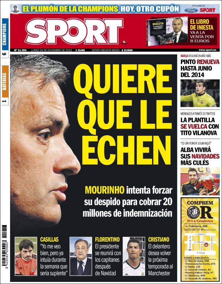 Sport: Chiede un indennizzo 24/12/2012 di Admin3 SPORT MOURINHO – Mourinho non parla di dimissioni però chiede 20 milioni di euro di indennizzo. La redazione di Calciomercatonews.com