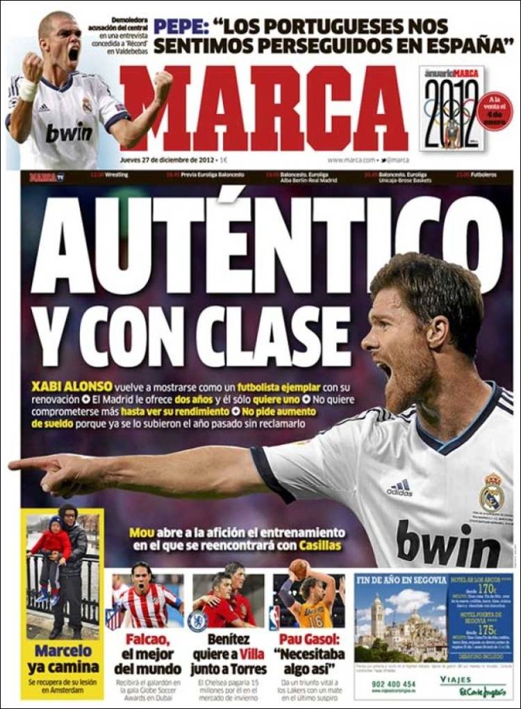 Marca: Autentico con classe 27/12/2012 di Admin3 MARCA XABI ALONSO – Sul quotidiano Marca si elogia Xabi Alonso, centrocampista spagnolo del Real Madrid. La redazione di Calciomercatonews.com