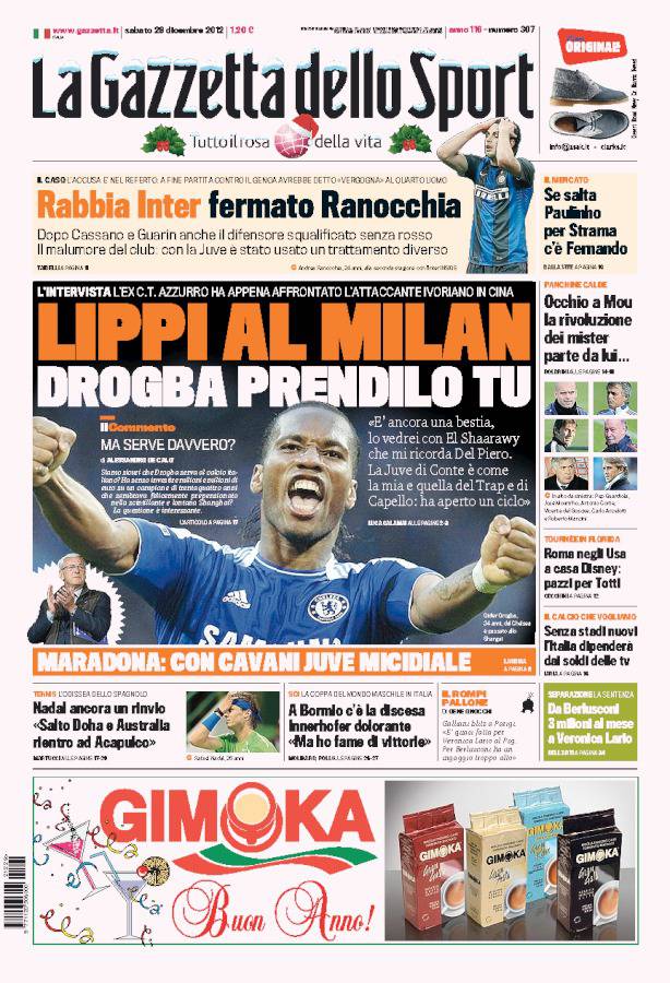 La Gazzetta dello Sport: Lippi al Milan: “Drogba prendilo tu!” 29/12/2012 di admin GAZZETTA DELLO SPORT PRIMA PAGINA – Poco più in basso la prima pagina de La Gazzetta dello Sport.