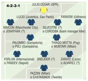CALCIOMERCATO INTER 2012 RIVOLUZIONE FORMAZIONE ADDII – Si chiude il 2012 e da Appiano Gentile si può staccare anche il cartello “rivoluzione in corso”. O forse no? Sta di fatto che nell’ultimo anno solare sono ben 15 i giocatori lasciati partire, e 5 quelli che a gennaio potrebbero lasciare l’Inter. Con la scelta di Andrea Stramaccioni è stato portato avanti un progetto che ha lasciato pochi spazi ai sentimentalismi da post triplete, lasciando posto ad un’idea di un’Inter giovane e bella. Con i partenti, o presunti tali a gennaio, si può schierare un 11 di tutto rispetto ed eccolo qui in foto tratto dall’edizione di oggi di Tuttosport: