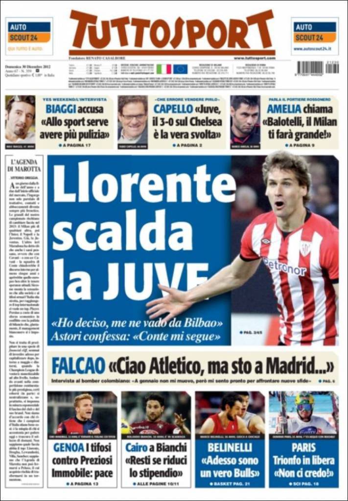 JUVENTUS LLORENTE – Fernando Llorente confessa: “Ho deciso, lascio il Bilbao”. Astori confessa: “Conte mi segue”. Capello: “Juve, il 3-0 sul Chelsea è la vera svolta”. Amelia chiama: “Balotelli, il Milan ti farà grande”.