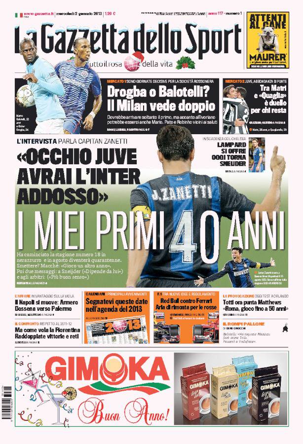Gazzetta dello Sport: “Occhio Juve avrai l’Inter addosso” 02/01/2013 di Admin3 GAZZETTA JUVENTUS INTER – Sulla Gazzetta dello Sport intervista a Zanetti, capitano dell’Inter, che lancia la sfida alla Juventus. La redazione di Calciomercatonews.com
