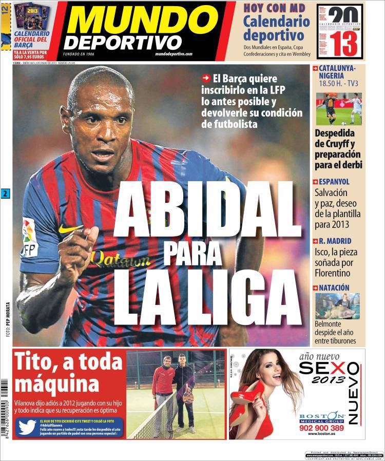 Mundo Deportivo: Abidal per la Liga 02/01/2013 di Admin3 MUNDO DEPORTIVO ABIDAL – Sul quotidiano Mundo Deportivo si parla di Abidal che il Barcellona vuole far tornare in campo. La redazione di Calciomercatonews.com