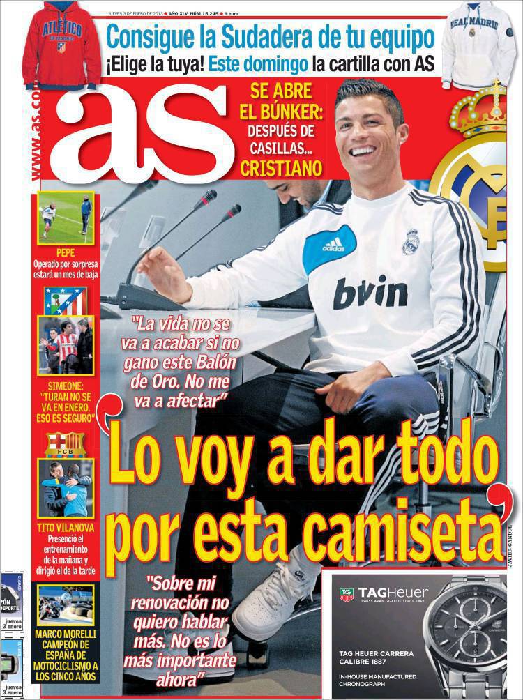 As: “Io voglio dar tutto per questa camiseta” 03/01/2013 di Admin3 AS RONALDO – Dichiarazioni d’amore di Cristiano Ronaldo al Real Madrid. La redazione di Calciomercatonews.com