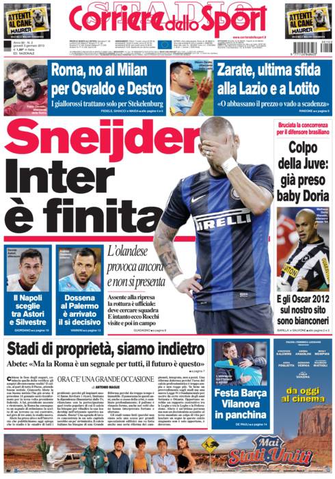 CORRIERE SNEIJDER INTER – Sul Corriere dello Sport si parla dell’olandese Sneijder che non si presenta al raduno.