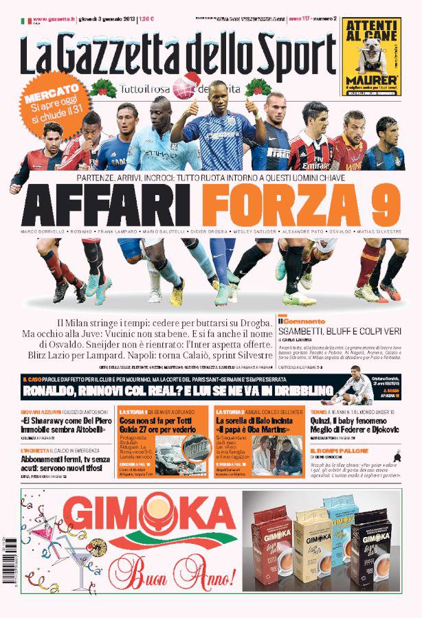 Gazzetta dello Sport: Affari forza 9 03/01/2013 di Admin3 GAZZETTA AFFARI – Sulla Gazzetta dello Sport si parla del mercato invernale che inizia ufficialmente oggi. La redazione di Calciomercatonews.com
