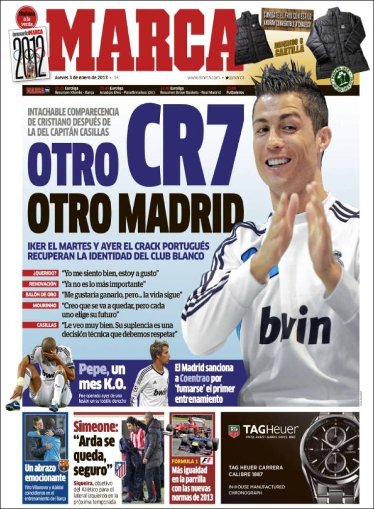 Marca: Altro Cr7 altro Real Madrid 03/01/2013 di Admin3 MARCA RONALDO – Sul quotidiano Marca si parla di Ronaldo che ha deciso di continuare l’avventura al Real Madrid. La redazione di Calciomercatonews.com