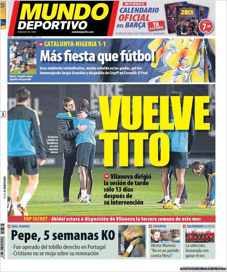 MUNDO DEPORTIVO VILANOVA – Sul quotidiano Mundo Deportivo si parla di Vilanova che è tornato a dirigere l’allenamento tredici giorni dopo l’operazione.
