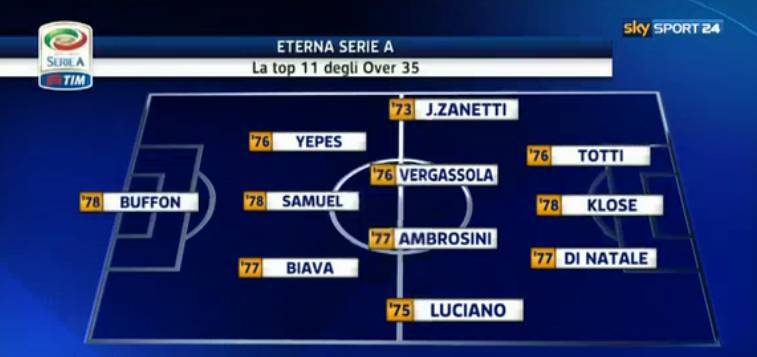 SERIE A TOP 11 OVER 35 – In tanti sostengono che il nostro sia un campionato per vecchi e forse non hanno tutti i torti. L’età media della Serie A è piuttosto alta e diversi giocatori superano i trent’anni. La redazione di Sky Sport 24 ha stilato una formazione con i migliori over 35 della massima serie. Tra i pali, neanche a dirlo, Gigi Buffon. Il trio difensivo, invece, è composto da Yepes, Samuel e Biava. A centrocampo Zanetti (il più anziano di questa top 11), Vergassola, Ambrosini e Luciano. Infine ecco Totti, Klose e Di Natale per un attacco che poche squadre possono permettersi.