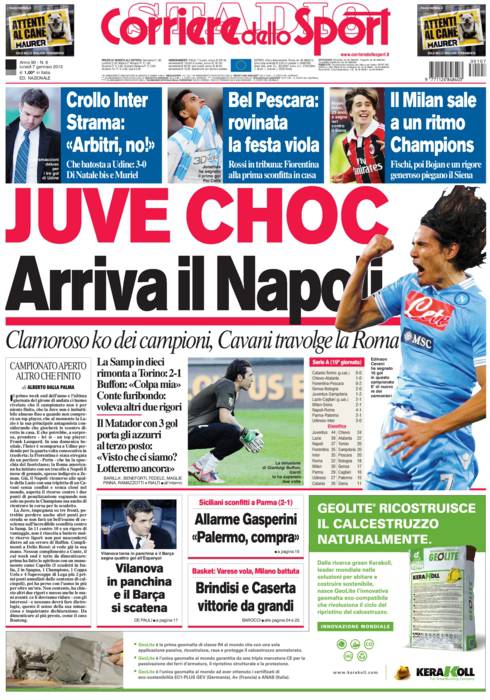 CORRIERE JUVENTUS NAPOLI – Sul Corriere dello Sport si parla del k.o. dei bianconeri in casa contro la Sampdoria. Il Napoli schianta la Roma quattro a uno.