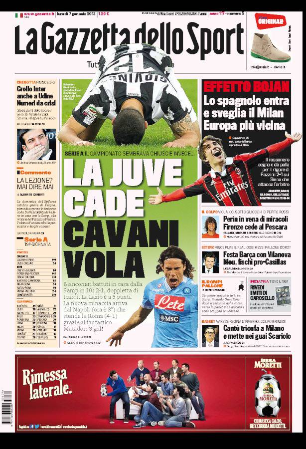 GAZZETTA JUVENTUS – Sulla Gazzetta dello Sport si parla della sconfitta casalinga della Juventus contro la Sampdoria. Il Napoli vola con Cavani.