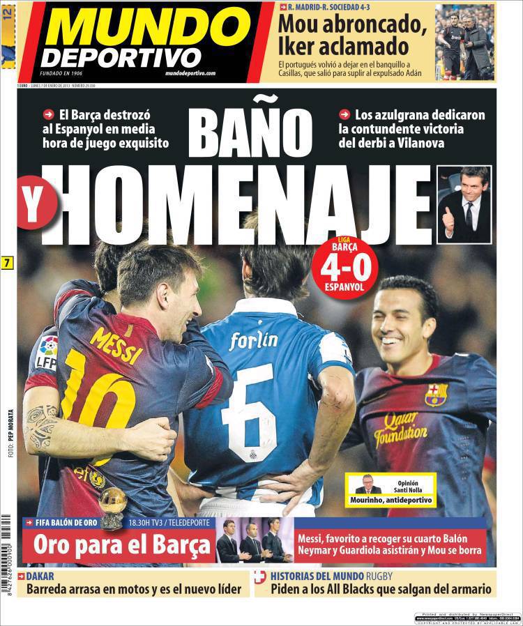 MUNDO DEPORTIVO BARCELLONA – Il Barcellona vince quattro a zero contro l’Espanyol e omaggia il ritorno in panchina di Vilanova.