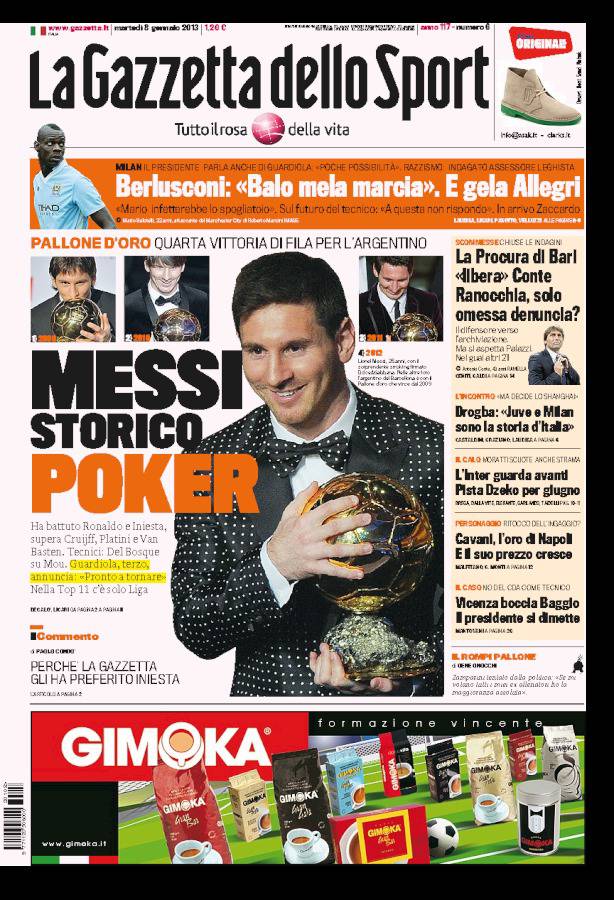 GAZZETTA MESSI – Sulla Gazzetta dello Sport si parla dello storico poker di Messi per quanto riguarda il Pallone d’Oro.