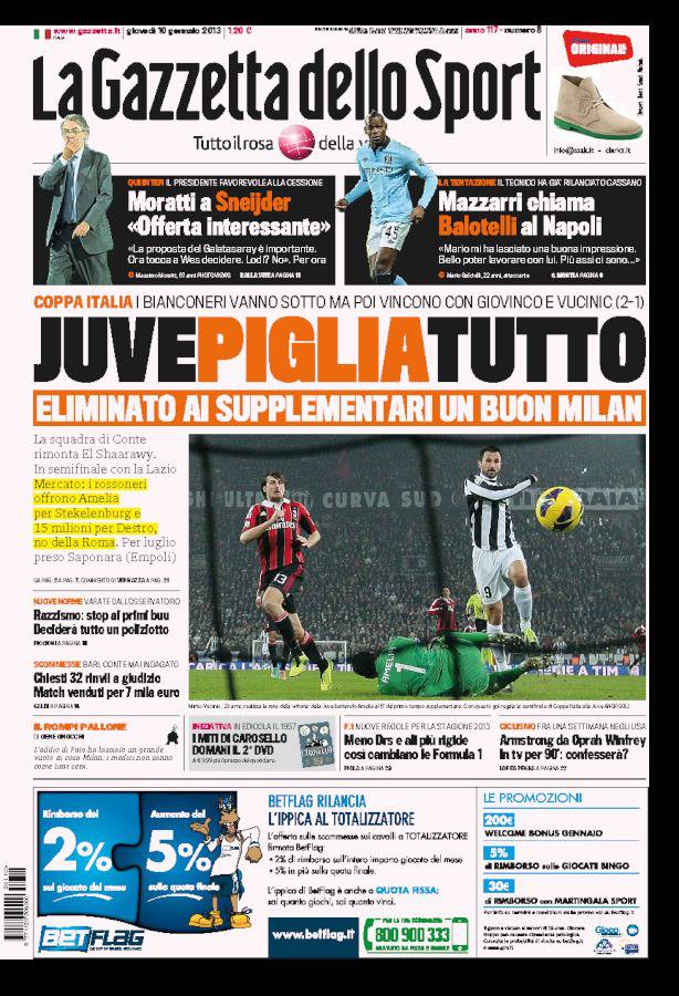GAZZETTA JUVENTUS – Sulla Gazzetta dello Sport si parla della Juventus che batte il Milan nei quarti di Coppa Italia.