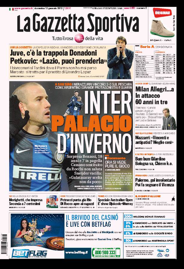 RASSEGNA STAMPA GAZZETTA DELLO SPORT – Torna alla vittoria l’Inter e lo fa battendo il Pescara per 2-0. Il protagonista assoluto della serata è stato Rodrigo Palacio, autore di un’ottima prestazione e del gol che ha sbloccato il match. Il raddoppio nerazzurro porta invece la firma di Guarin. La Gazzetta dello Sport celebra così la squadra di Andrea Stramaccioni.