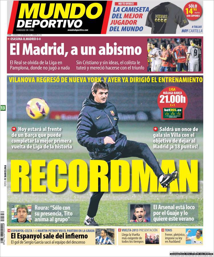 RASSEGNA STAMPA MUNDO DEPORTIVO – Questa mattina, il quotidiano spagnolo Mundo Deportivo dedica meritatamente la prima pagina a Tito Vilanova. Il tecnico del Barcellona ha fatto ritorno da New York (dove si trovava per incontrare uno specialista nel campo dell’oncologia), ieri era in Spagna e ha diretto l’allenamento. Questa sera i suoi giocatori scenderanno in campo alle 21 contro il Malaga e lui sarà in panchina a guidarli.