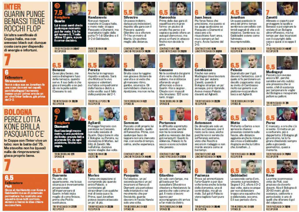 INTER BOLOGNA VOTI PAGELLE GAZZETTA – Poco più in basso potrete visionare i voti e le pagelle Gazzetta dello Sport relativi alla sfida fra l’Inter e il Bologna, gara che si è giocata ieri sera allo stadio San Siro, valevole per i quarti di finale di Coppa Italia e conclusasi con la vittoria ai supplementari della compagine nerazzurra. Migliore dell’incontro, il solito Fredy Guarin, ieri in rete per la settima volta nelle ultime otto gare. Molto bene anche Ranocchia, autore del gol vittoria, nonchè il solito Zanetti. Continua ad essere disastroso invece Jonathan.