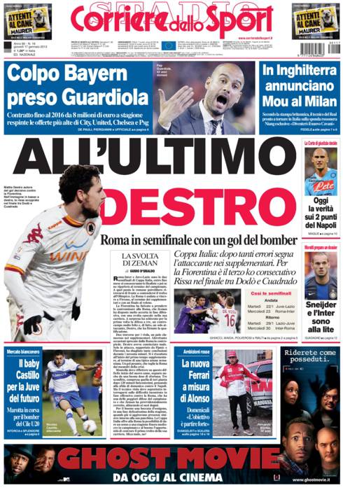 CORRIERE DESTRO – Sul Corriere dello Sport si parla dei quarti di finale di Coppa Italia con la Roma che batte la Fiorentina uno a zero con gol di Destro.