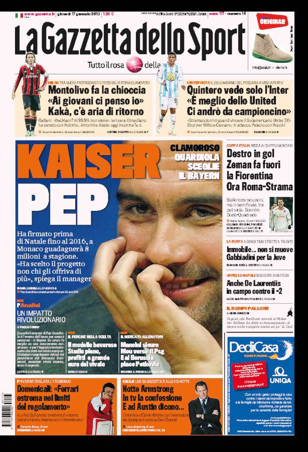 GAZZETTA GUARDIOLA – Sulla Gazzetta dello Sport si parla di Guardiola che ha firmato per il Bayern Monaco.