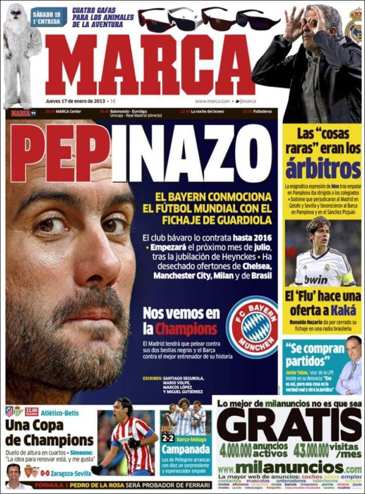 MARCA GUARDIOLA – L’annuncio dell’ingaggio di Guardiola da parte del Bayern Monaco ha fatto il giro del mondo.