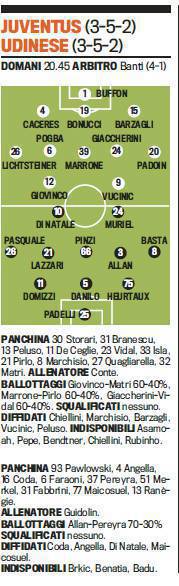 JUVENTUS UDINESE PROBABILI FORMAZIONI – Poco più in basso potrete visionare le probabili formazioni di Juventus-Udinese firmate Gazzetta dello Sport. Emergenza a centrocampo per la Vecchia Signora che dovrà fare a meno con grande probabilità di Pirlo, Marchisio e Vidal. Spazio quindi al trio inedito Giaccherini, Pogba e Marrone, con le fasce occupate da Padoin e Lichtsteiner. In attacco coppia titolare Giovinco-Vucinic mentre in difesa dovrebbe giocare ancora Caceres con Federico Peluso in panca, spalleggiato da Barzagli e Bonucci.