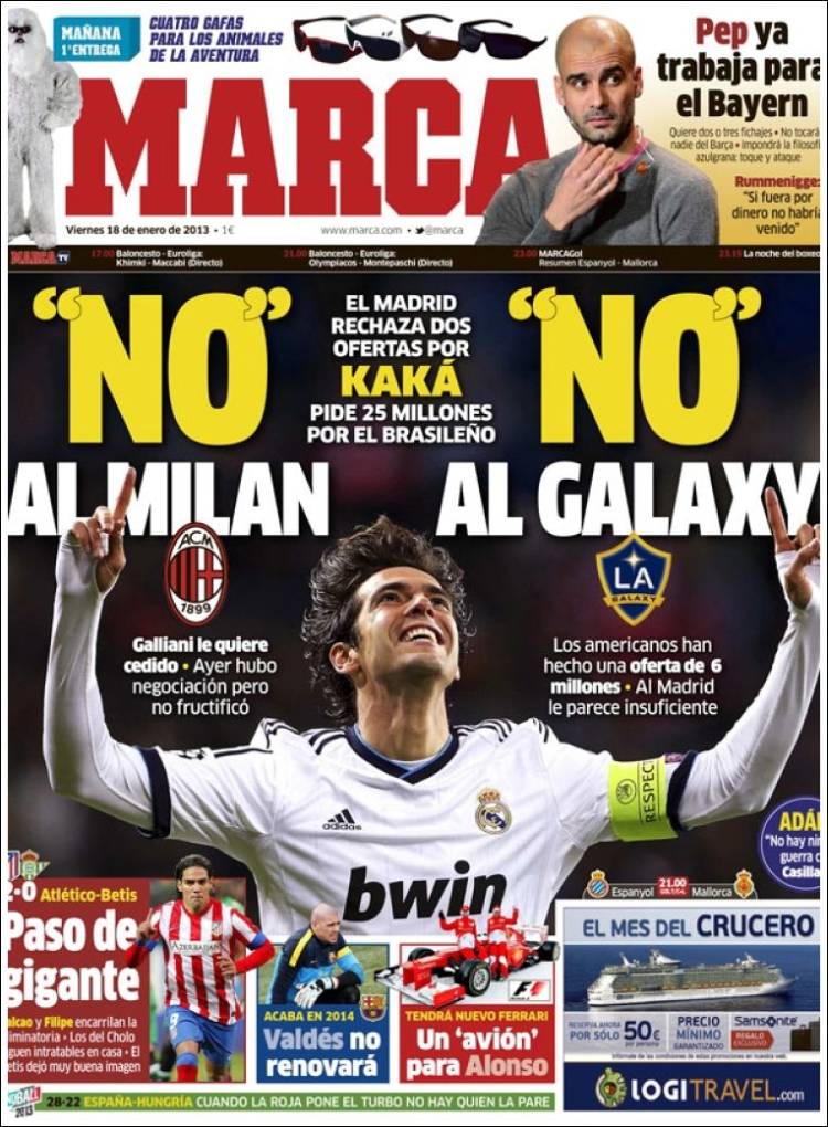 MARCA MILAN – Il quotidiano Marca rivela che il Real Madrid rifiuta il prestito di Kakà al Milan o ai Galaxy. Vuole 25 milioni di euro.