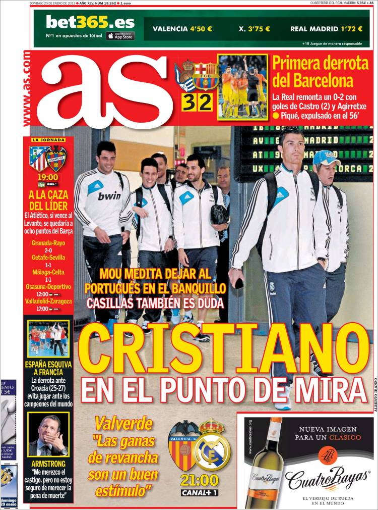 REAL CRISTIANO RONALDO –  Mourinho medita di lasciare Cristiano Ronaldo in panchina. Anche Casillas in dubbio. Valverde: “Il desiderio di vendetta è uno stimolo buono”. Prima sconfitta del Barcellona: il Real Saragozza rimonta lo 0-2 iniziale e batte i blaugrana per 3-2.