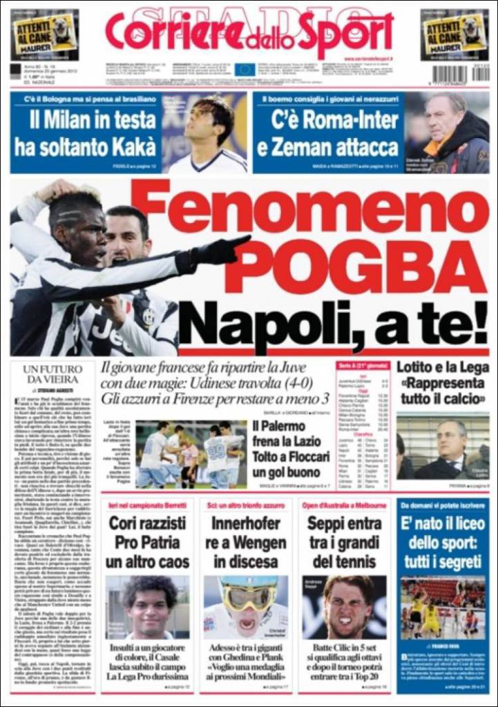 JUVENTUS POGBA NAPOLI – La Juventus batte l’Udinese 4-0. Protagonista della serata Paul Pogba. Il giovane francese fa ripartire la Juve con due magie. Gli azzurri a Firenze per restare a -3. Il Milan in testa ha soltanto Kakà: c’è il Bologna ma si pensa al brasiliano. C’è Roma-Inter: il boemo consiglia i giovani ai nerazzurri.