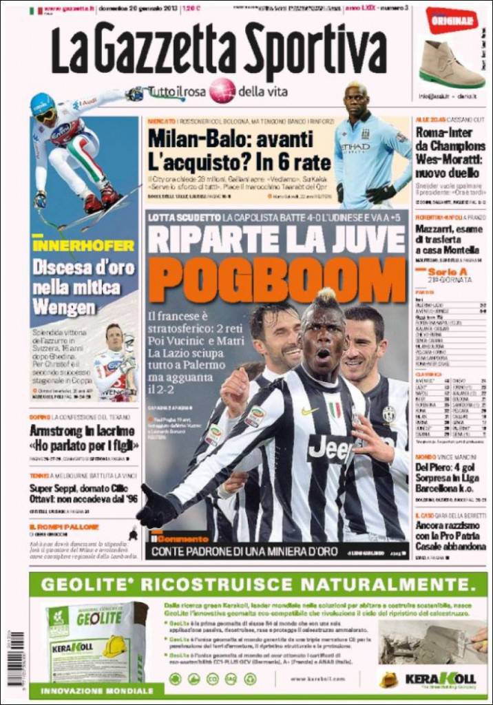 JUVENTUS POGBA MILAN BALOTELLI – Lotta scudetto: la capolista batte l’Udinese 4-0 e va a +5. Il francese è stratosferico: 2 reti. Poi Vucinic e Matri. La Lazio sciupa tutto a Palermo ma agguanta il 2-2. Milan-Balotelli: avanti. L’acquisto in sei rate? Roma-Inter da Champions. Sneijder-Moratti: nuovo duello.