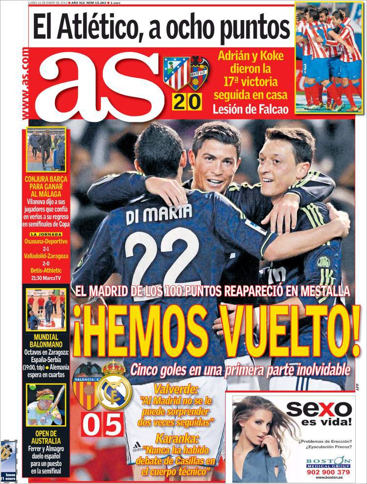 AS REAL MADRID – Sul quotidiano As si parla del Real Madrid che vince cinque a zero al Mestalla.