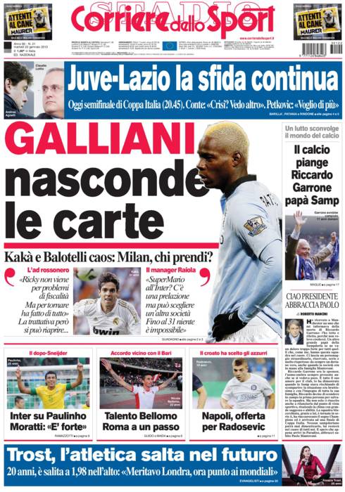 Corriere dello Sport: Galliani nasconde le carte 22/01/2013 di Admin3 CORRIERE GALLIANI – Adriano Galliani continua a nascondere le carte per quanto riguarda Kakà e Baotelli. la redazione di Calciomercatonews.com